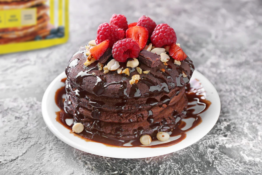 Drizzle the melted dark chocolate over the pancakes and add toppings