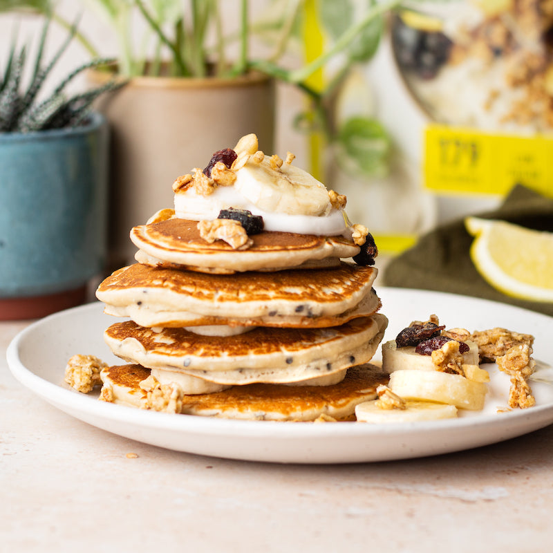 - Once all the mix is used, serve pancakes with banana, coconut yoghurt and granola. Enjoy!