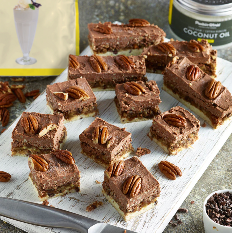 - Remove from the freezer and spread the toffee pecan layer across the base