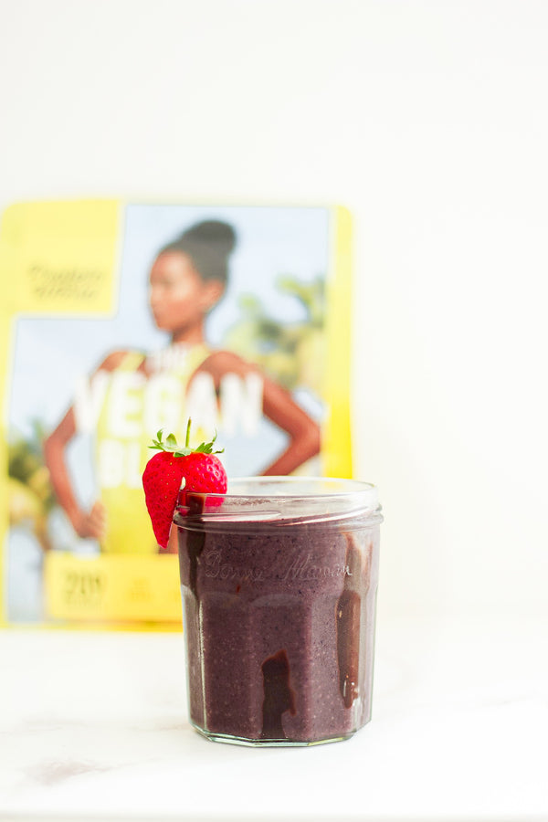 Mix all ingredients in a blender until smooth. Pour into a jar or a bowl and add toppings if desired.